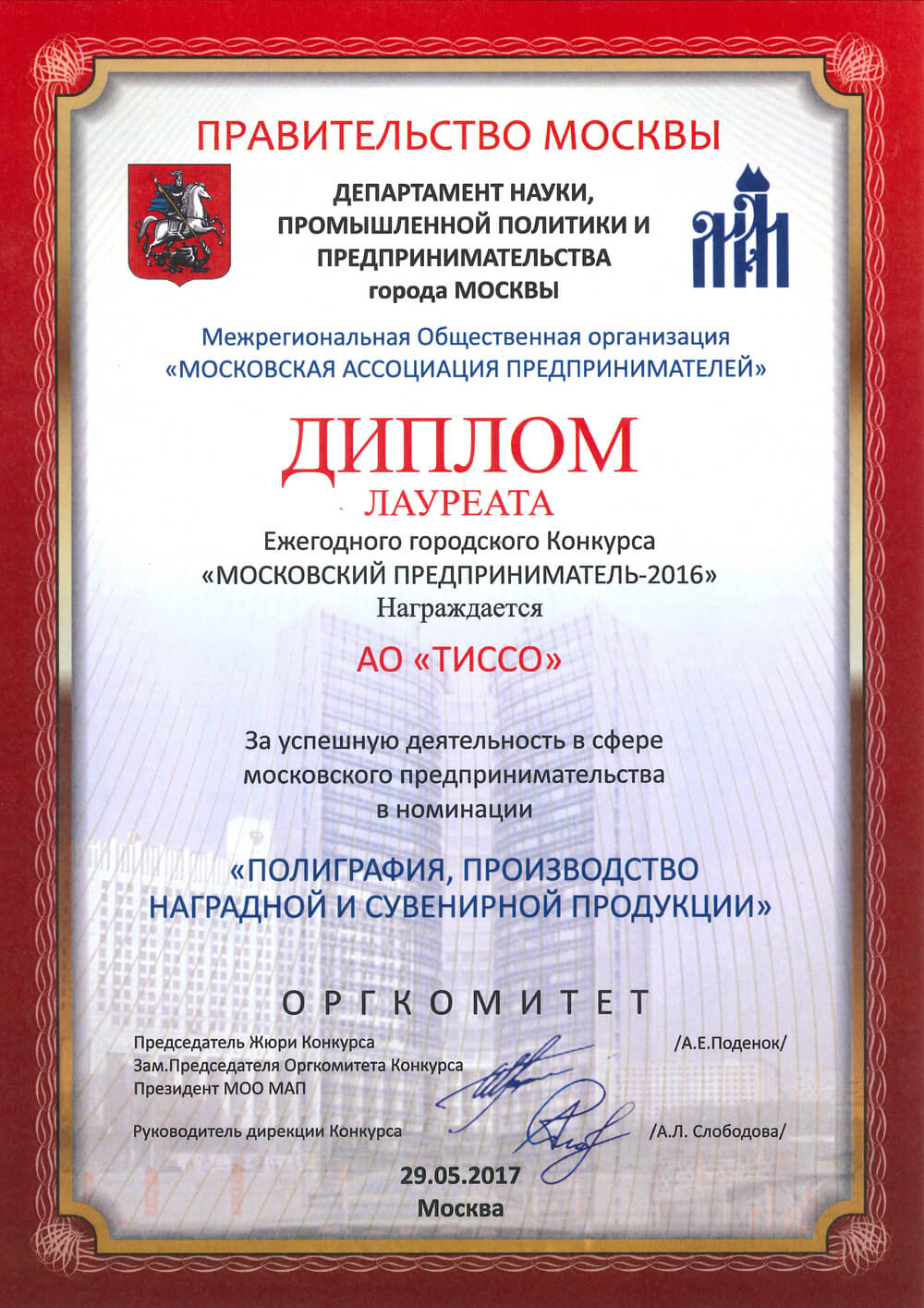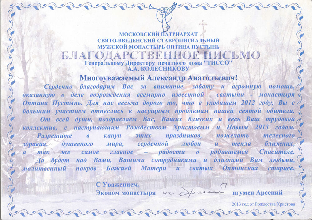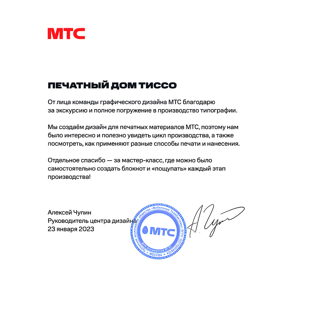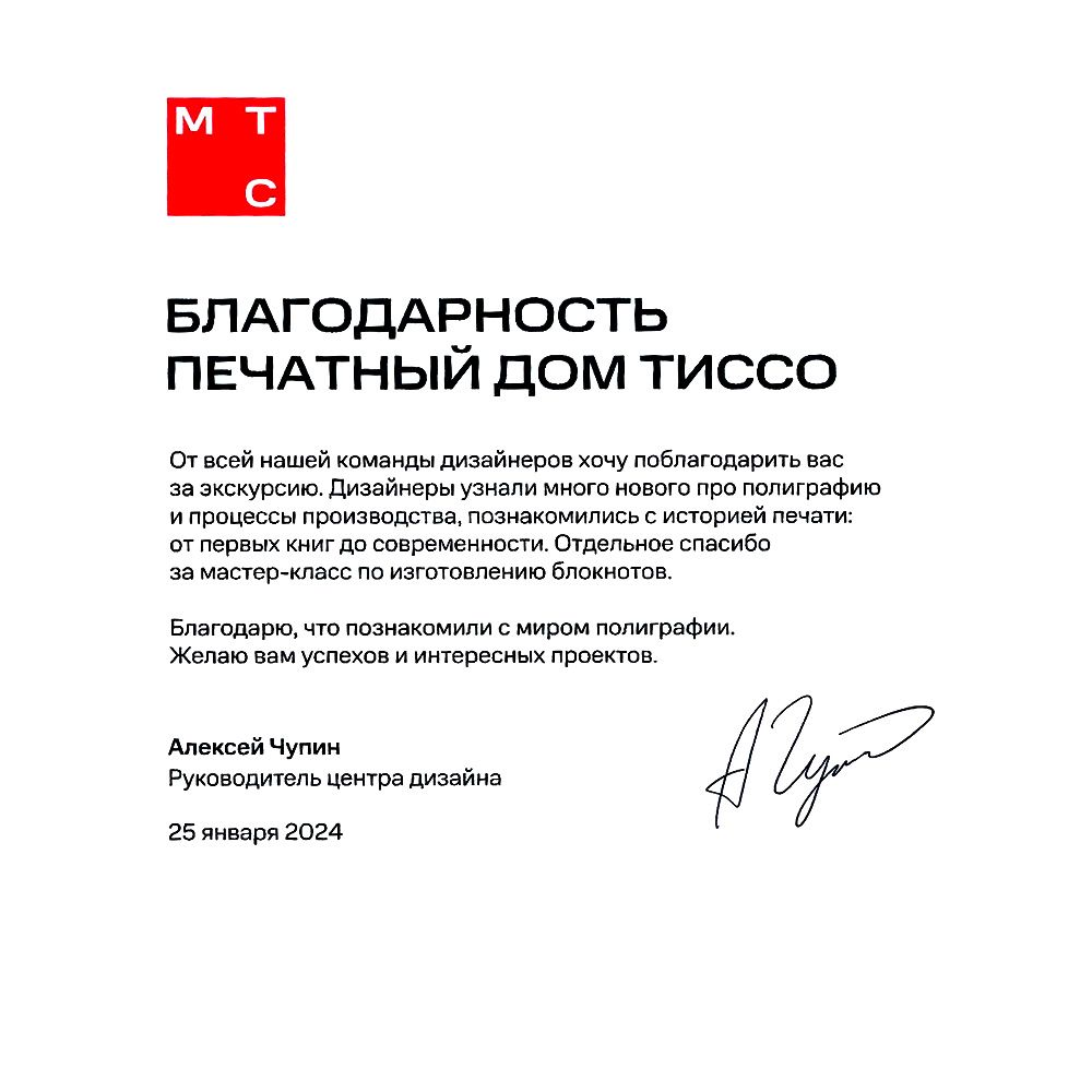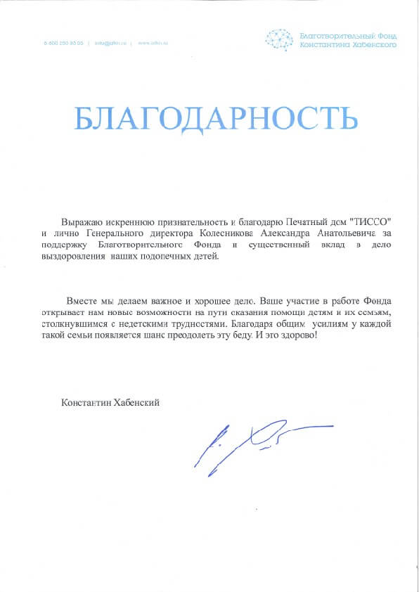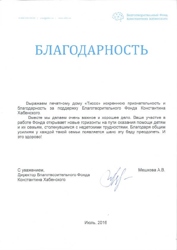За прошедшие с момента основания Печатного дома «ТИССО» четверть века, компания достигла профессиональных высот и предприятию есть, чем по праву гордиться. Мы честно относимся к своей работе и не теряем интерес к любимому делу, поэтому нам доверяют заказчики. Их положительные отзывы и благодарности выступают весомой рекомендацией наших услуг.