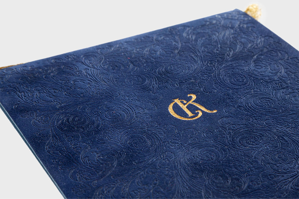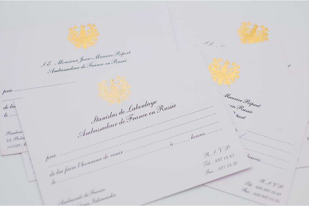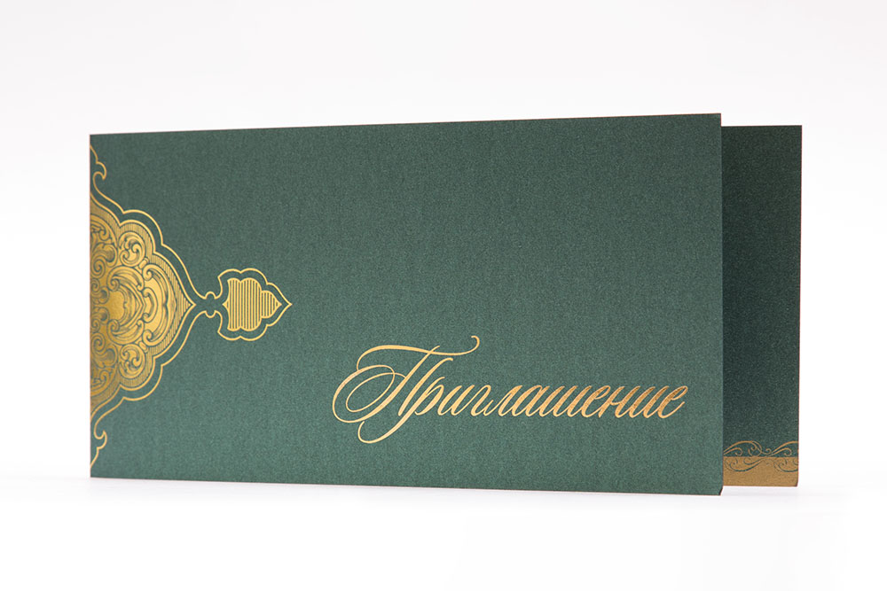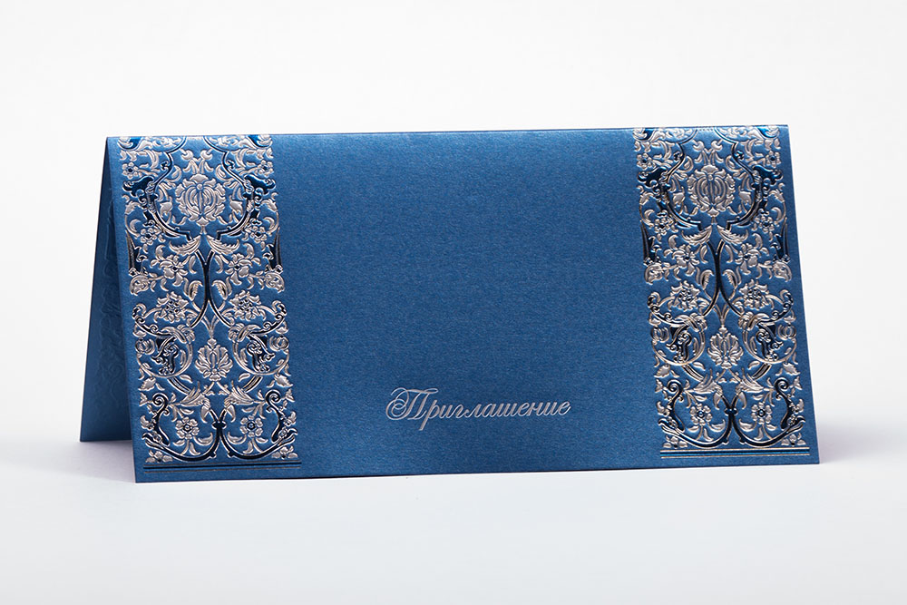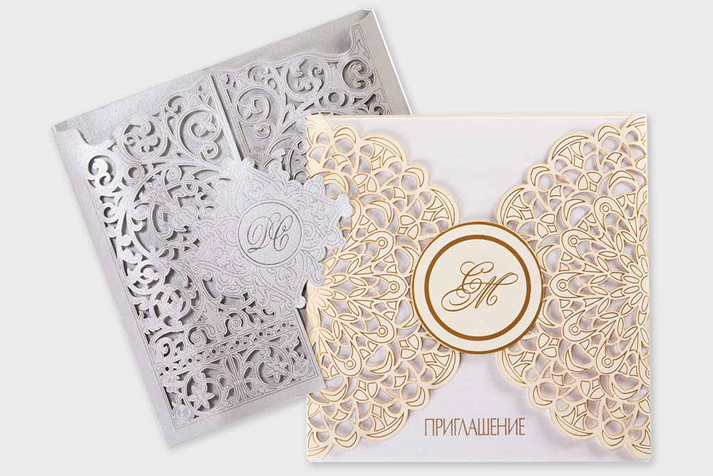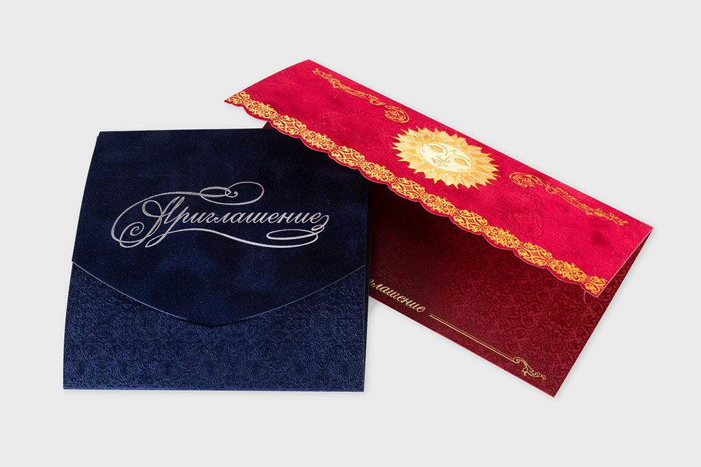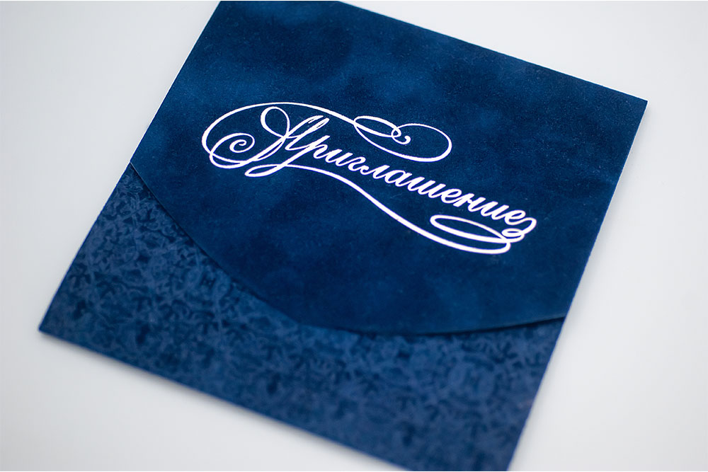 Мы используем тиснение фольгой — золотой, серебряной или цветной, конгрев для создания рельефа, блинт (тиснение без фольги) и микрорельефное тиснение для тонких деталей. Ламинирование защищает поверхность бумаги и придаёт матовый или глянцевый эффект. Для заказов со сложными формами применяем вырубку или лазерную резку, а при изготовлении конструктивных пригласительных из нескольких частей выполняем ручную сборку.