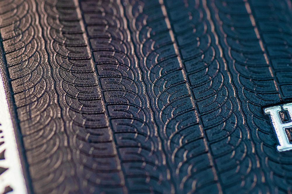 Натуральная кожа – идеальный материал для тиснения. Её структура пластична, но запоминает форму навсегда. Но одинаковых шкур не бывает, даже в одной партии каждая отличается по цвету и фактуре – это надо учитывать. Иногда производители наносят на кожу покрытия, которые препятствуют нанесению фольги, поэтому мы рекомендуем делать пробный образец для каждого тиража при работе с натуральной кожей.