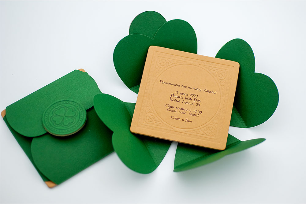Работа начинается с выбора сценария: дизайн создаётся в нашей студии или дорабатывается файл заказчика. В первом случае мы готовим несколько концепций — с учётом повода, бумаги и планируемой отделки. Из них выбирается одна для дальнейшей работы.